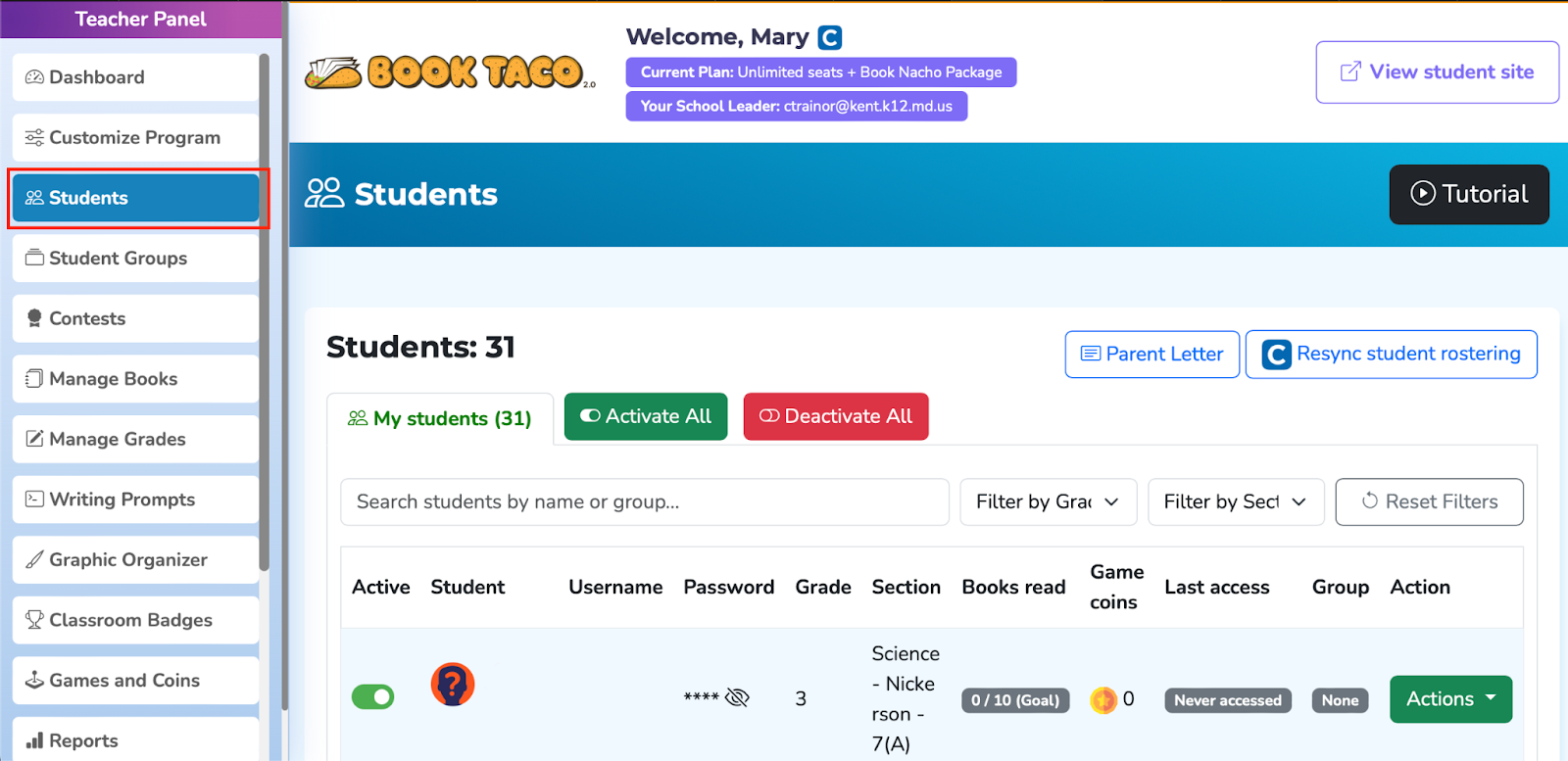 The process for refreshing your student roster is quite simple. When you need to do this, log into that teacher's Book Taco account.